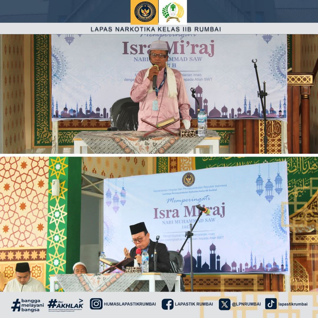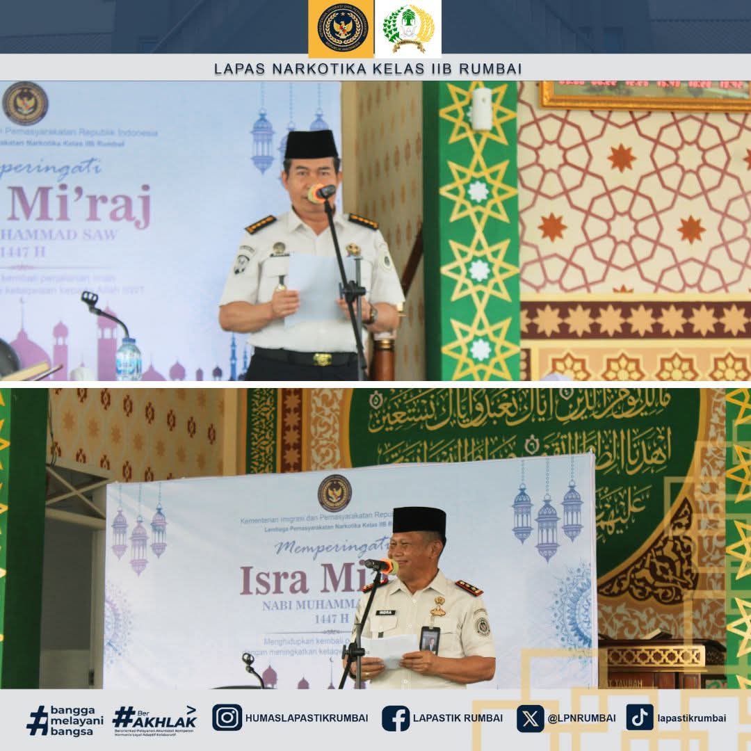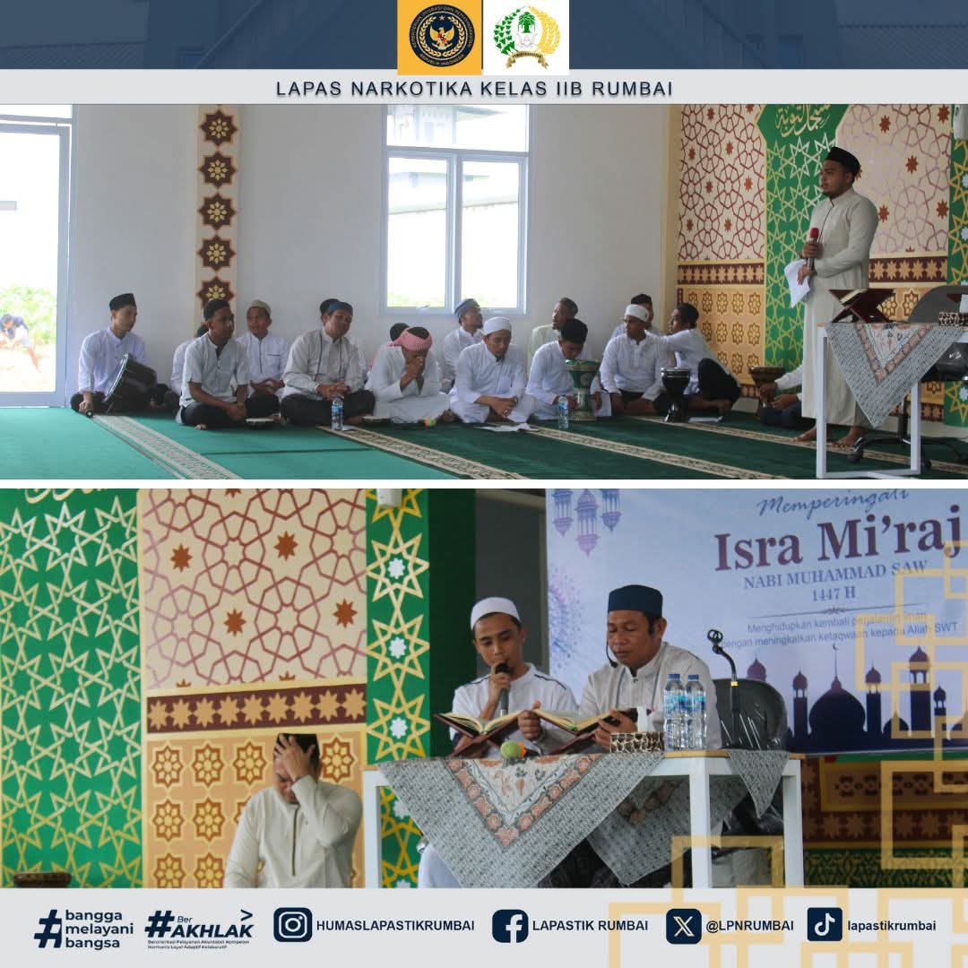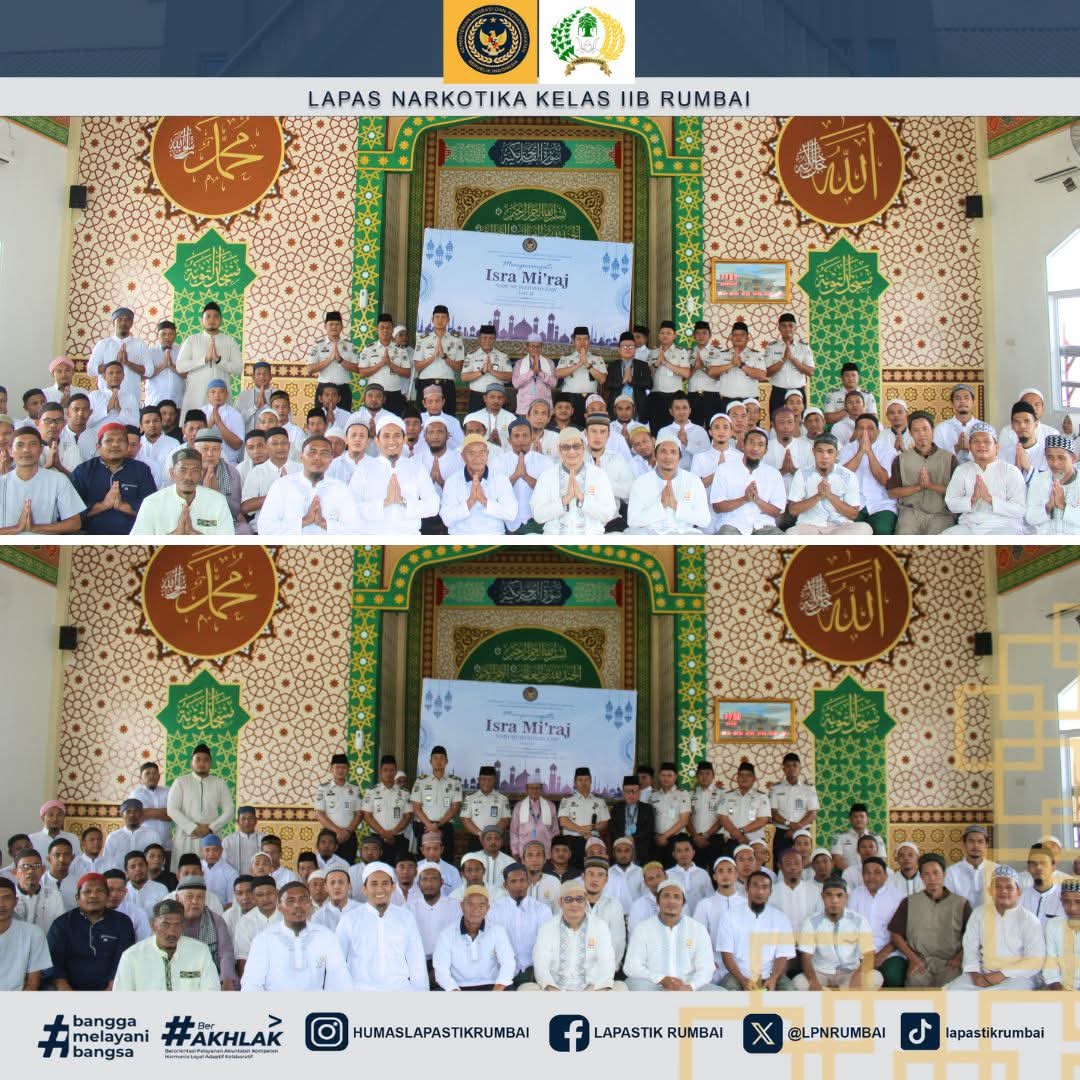 Pekanbaru – Lapas Narkotika Kelas IIB Rumbai memperingati Isra Mikraj Nabi Muhammad SAW dengan menggelar kegiatan tausiah keagamaan yang bertempat di Masjid At-Taubah Lapas Narkotika Rumbai. Kegiatan ini diikuti oleh Kepala Bidang Pelayanan dan Pembinaan Kanwil Ditjenpas Riau, Suroto yang didampingi langsung oleh Kepala Lapas Narkotika Kelas IIB Rumbai, Reinhards Indra Pitoy, pejabat struktural, jajaran petugas, serta Warga Binaan Pemasyarakatan (WBP) yang mengikuti kegiatan santri di Lapas dengan penuh khidmat dan antusias (19/01/2026).
